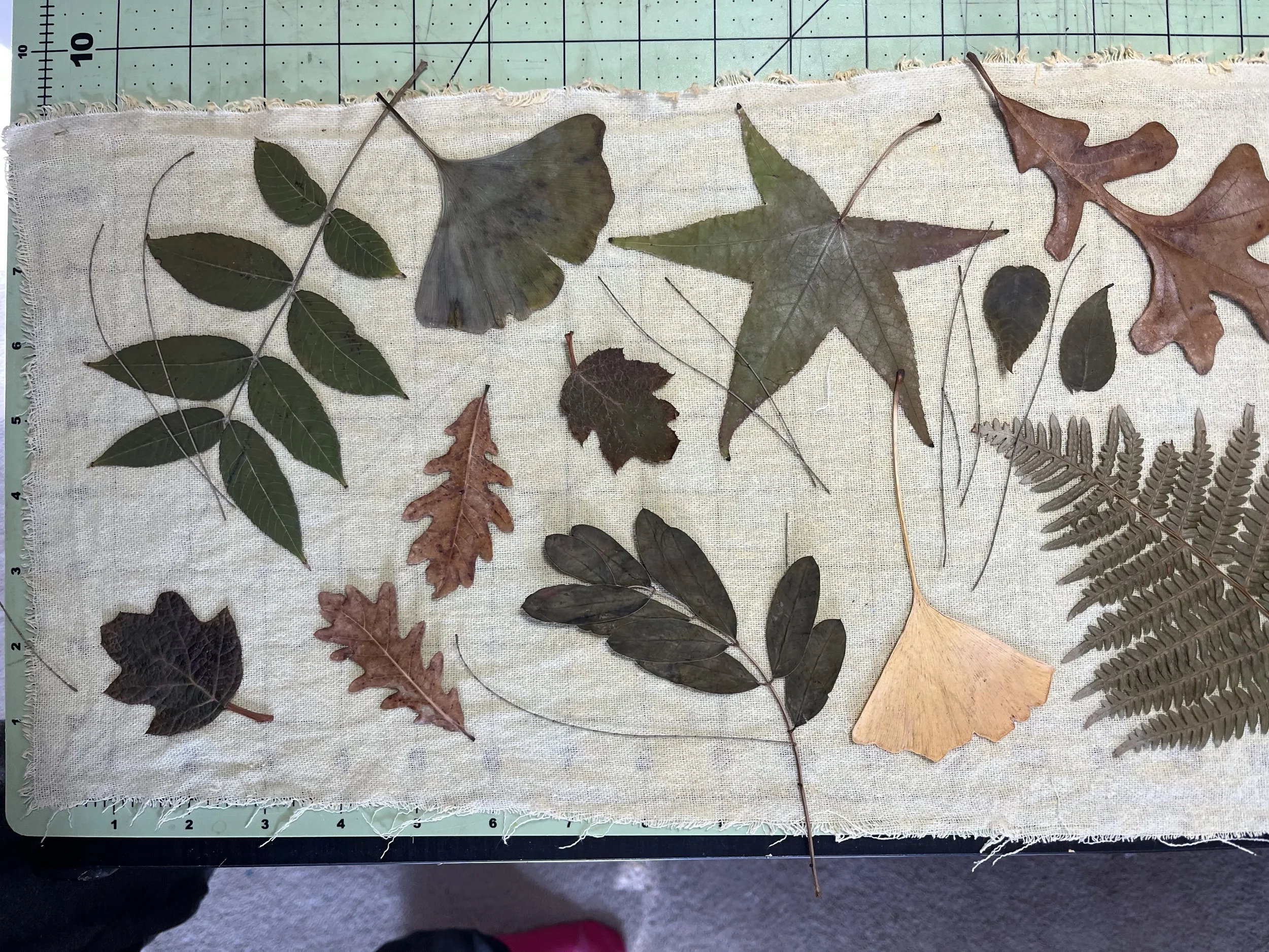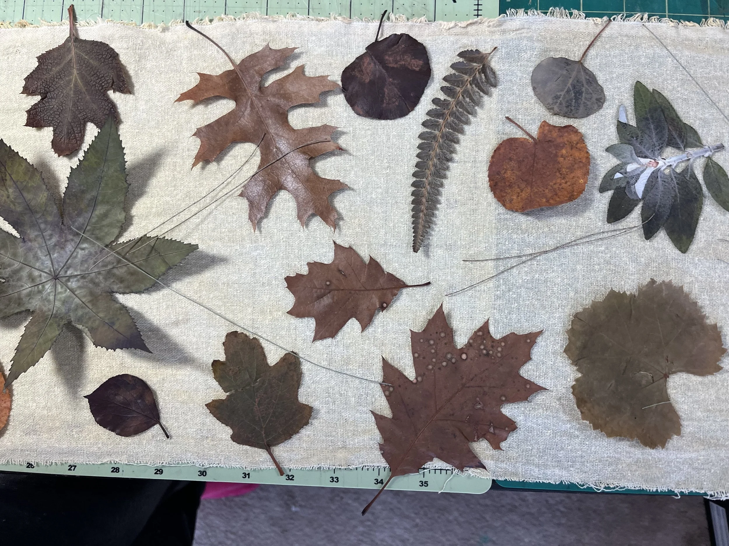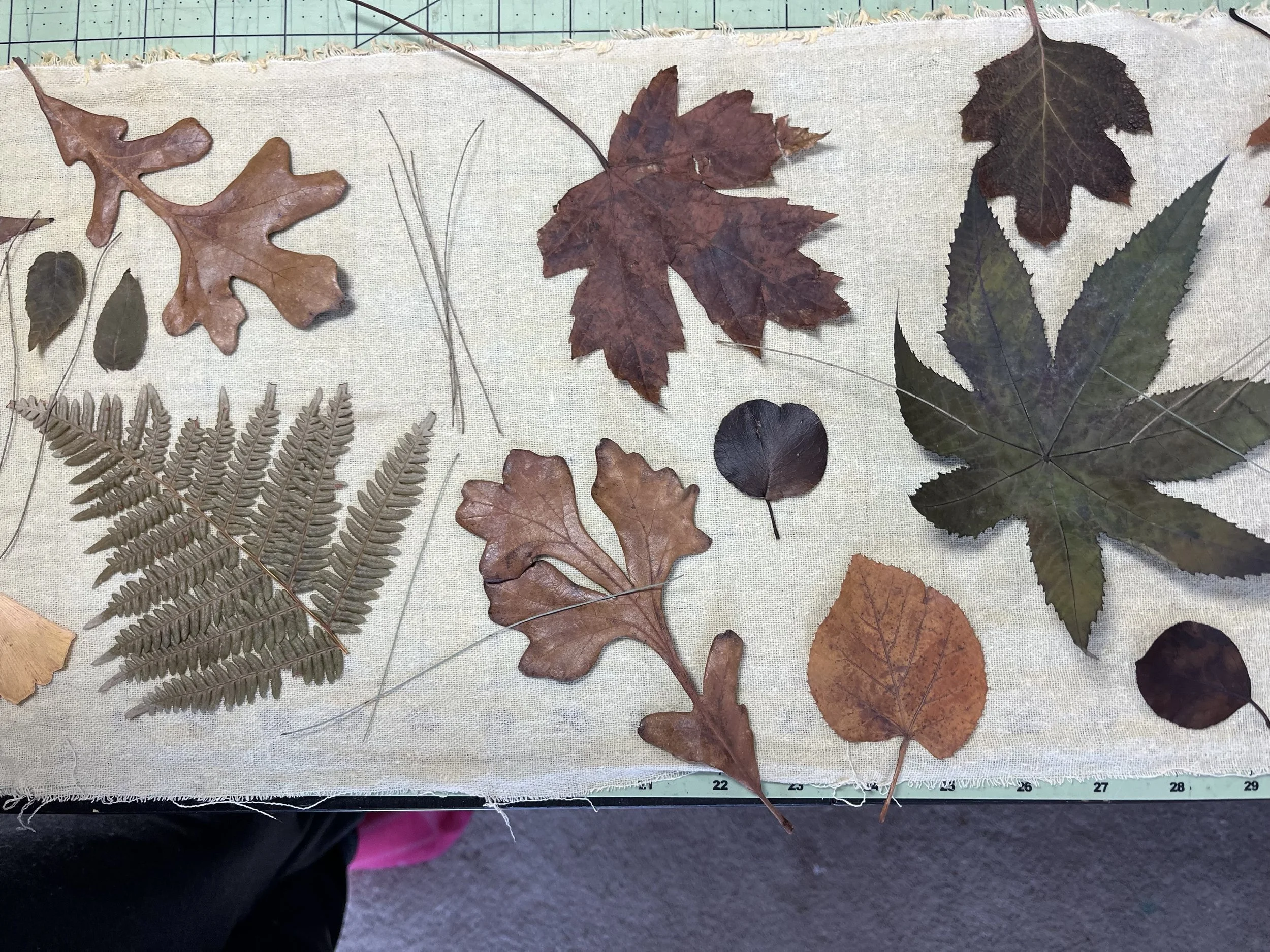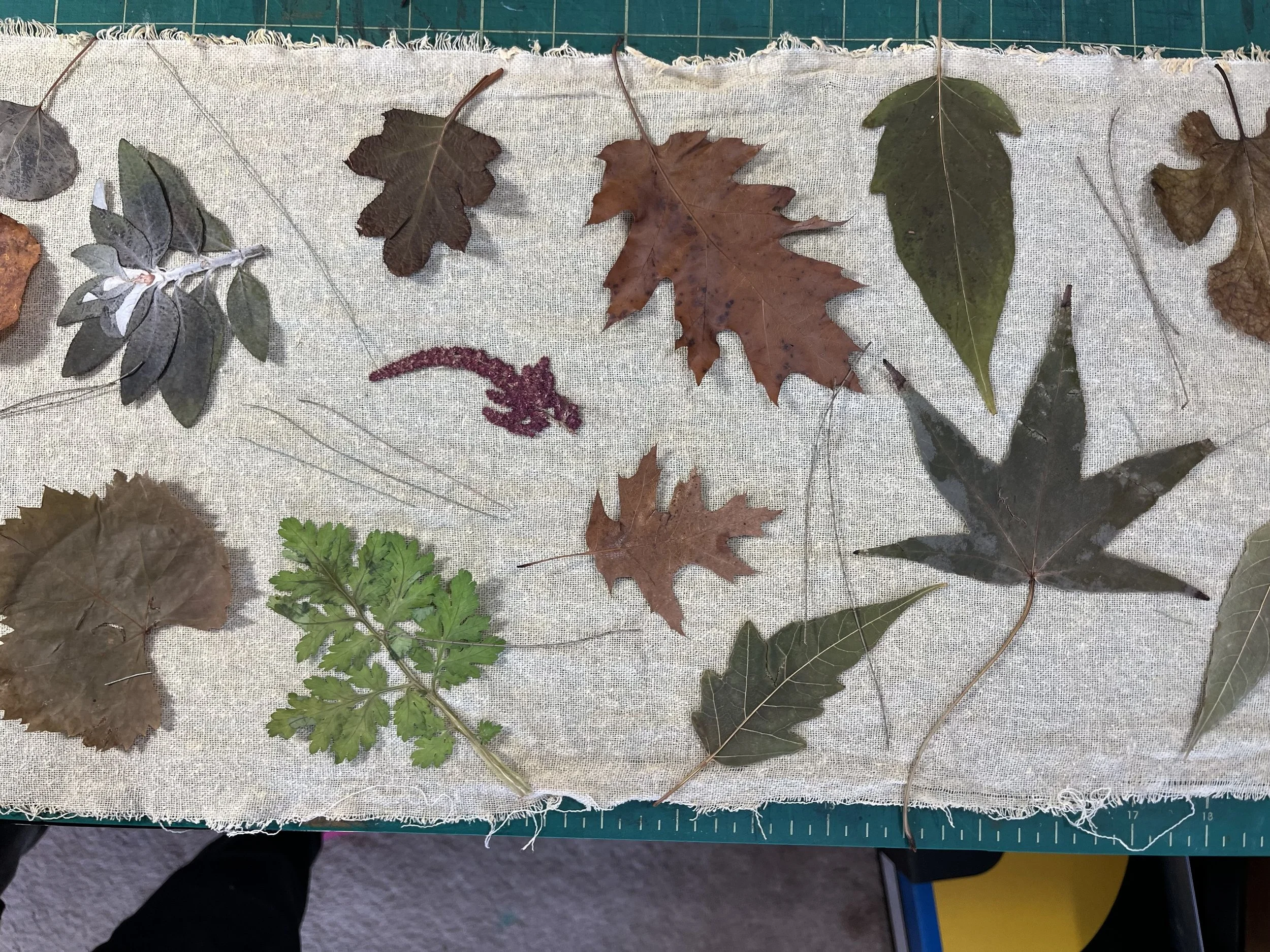 Mulberry, oak, marcela, hydrangea leaves and flowers, sweet gum, sumac, black walnut, ginkgo, birch, Japanese maple, casuarina, linden, smoke bush, horse chestnut, coreopsis, ferns, grape, ricinus, silver maple.
