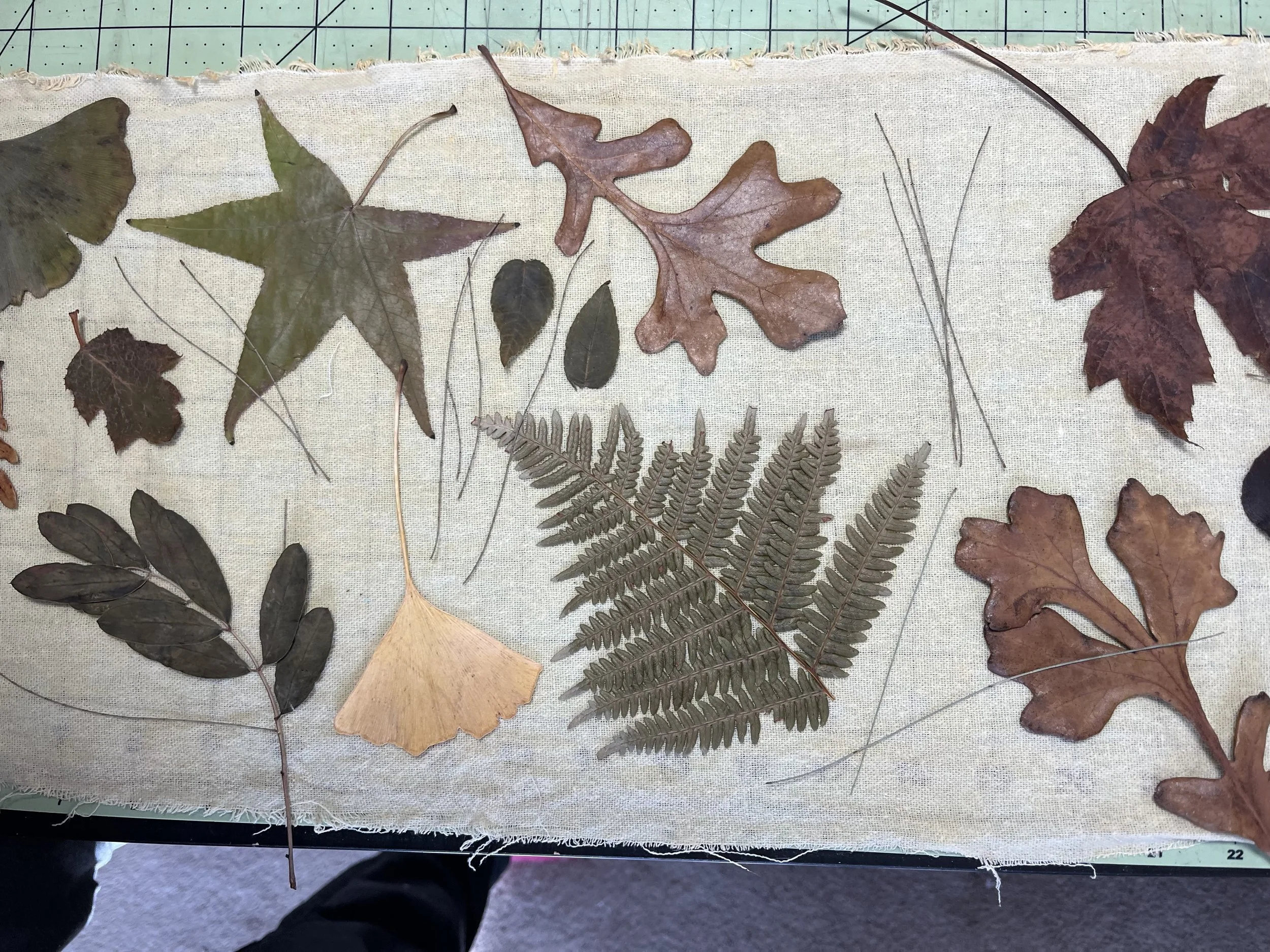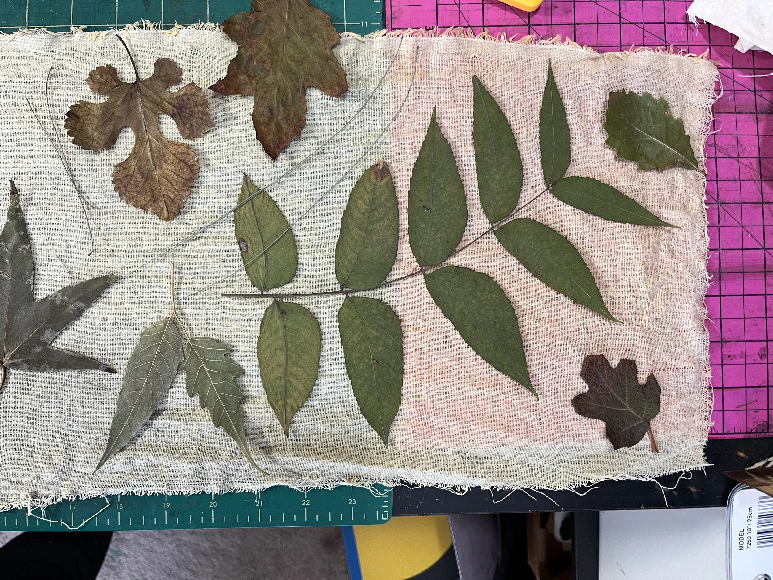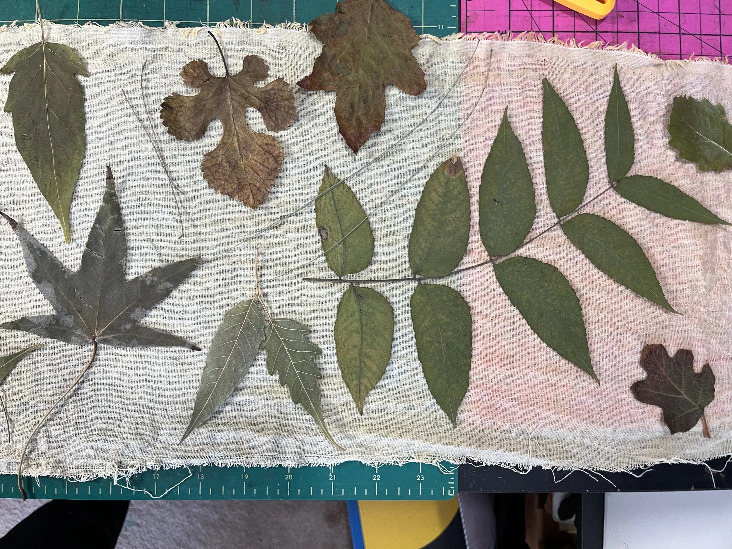 Mulberry, oak, marcela, hydrangea leaves and flowers, sweet gum, sumac, black walnut, ginkgo, birch, Japanese maple, casuarina, linden, smoke bush, horse chestnut, coreopsis, ferns, grape, ricinus, silver maple.