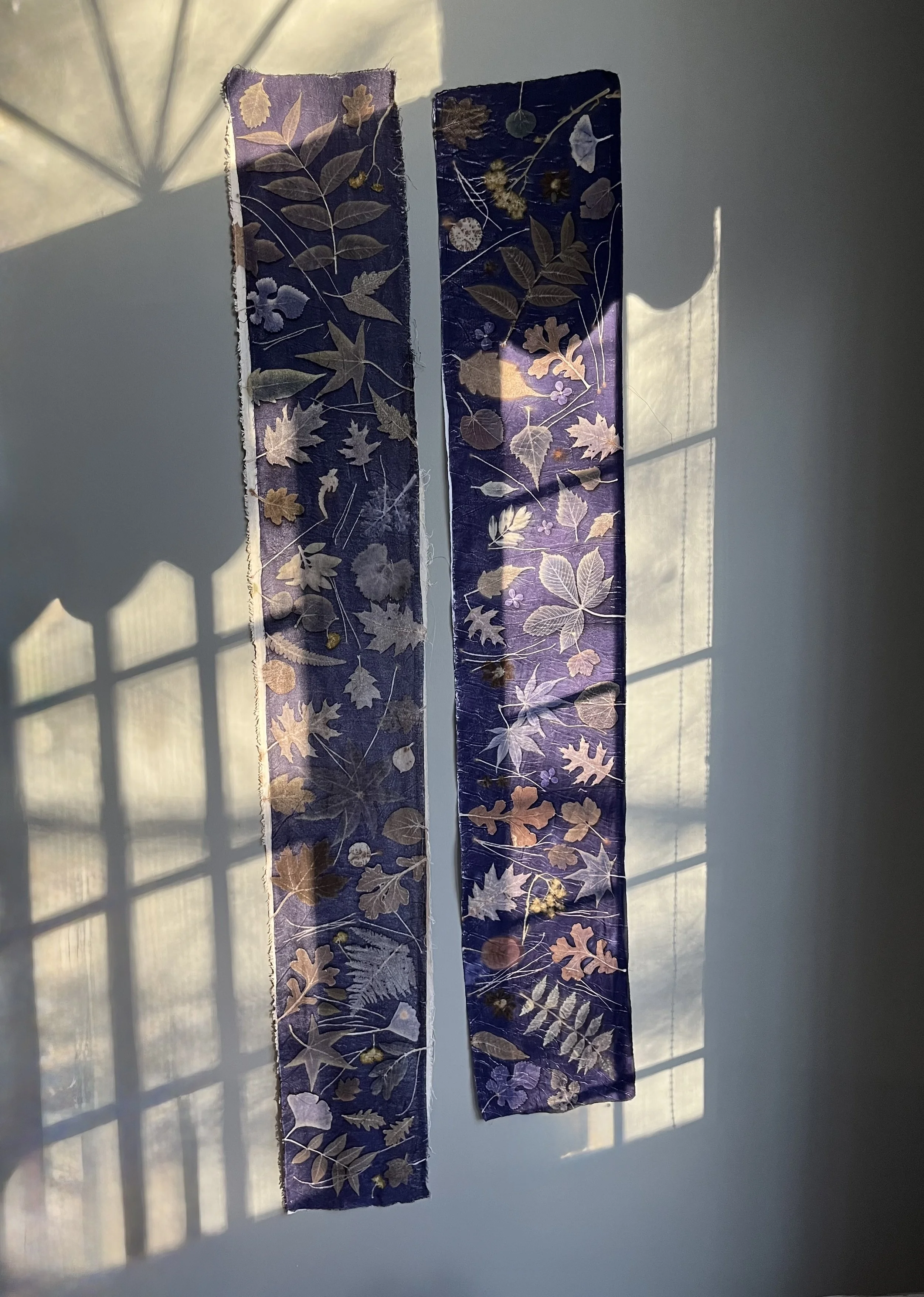 All silk is pre-mordanted with alum, traditional bath: 1 hour simmer. Extra Alum is applied cold, one hour soak.
